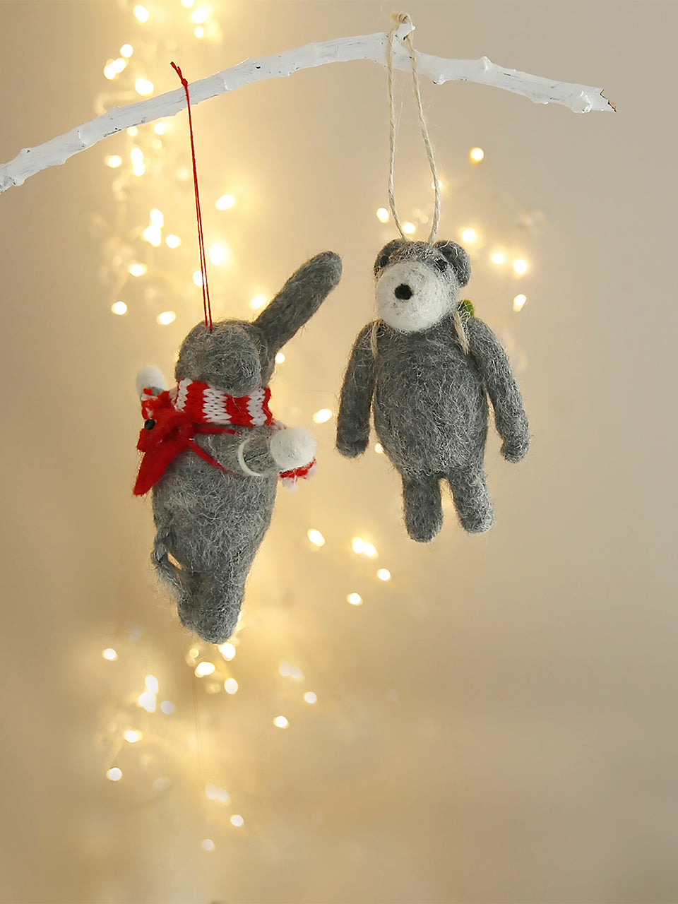 Delizioso elefante o orso in feltro, ognuno con un piccolo zaino, pronto per i viaggi di Natale. Pronto da appendere all'albero di Natale o nella cameretta dei bambini durante le feste e per tutto l'anno.