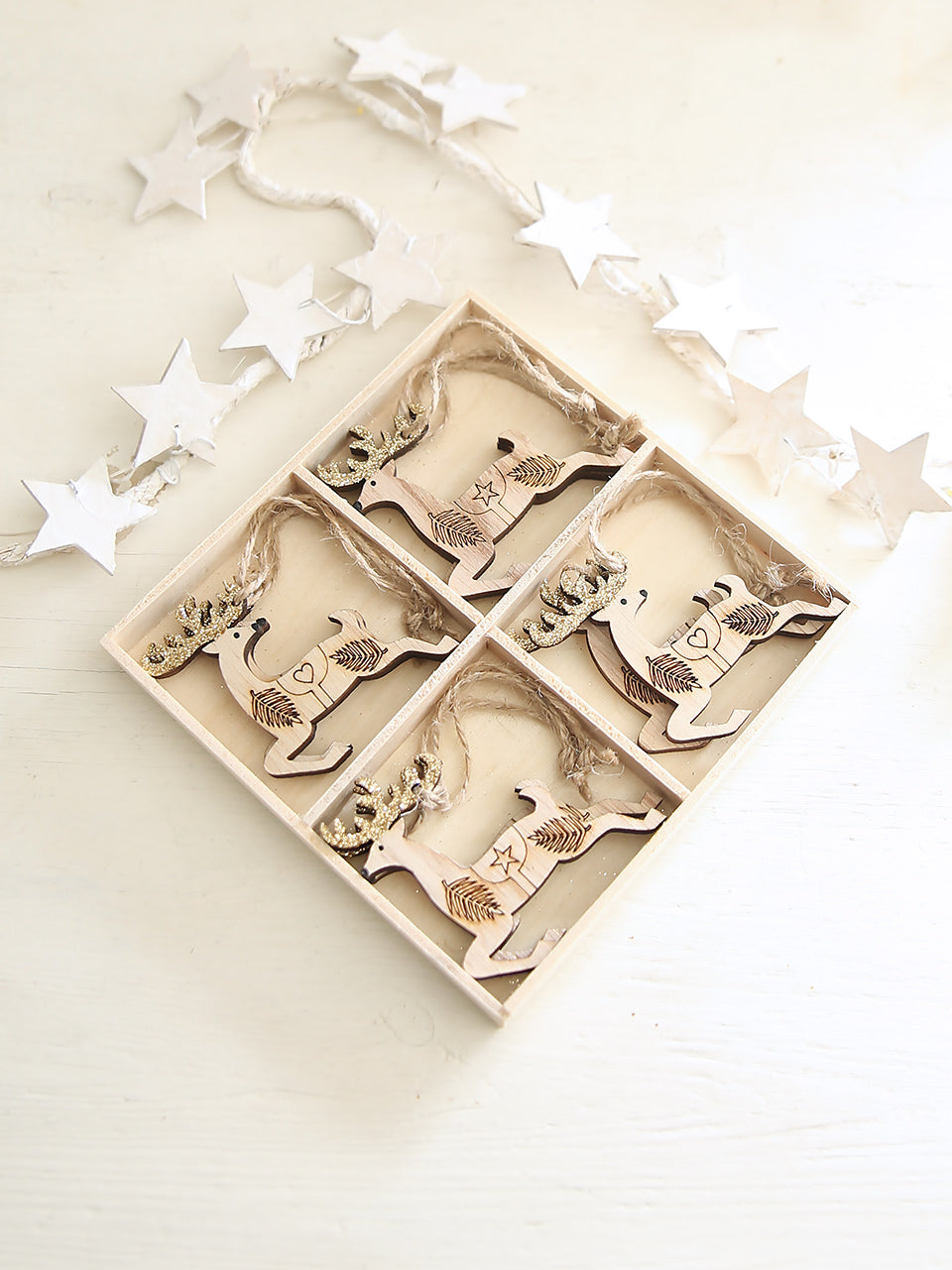 Presentato in un vassoio di legno sigillato con 8 decorazioni a forma di renna incluse. Piccole parti non adatte a bambini di età inferiore a 3 anni.