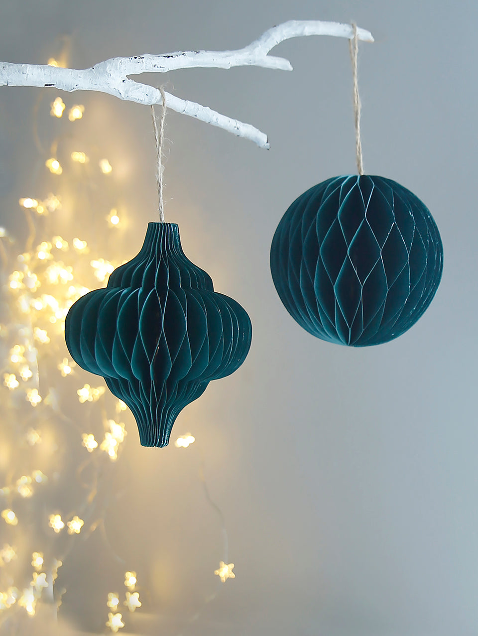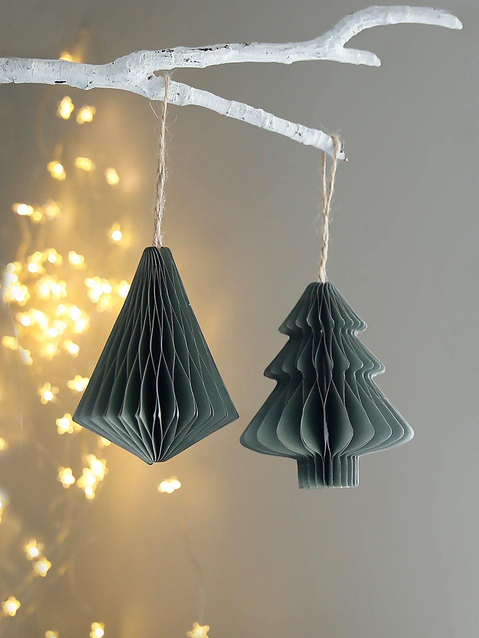 Decorazioni di carta insolite in un intenso grigio ardesia e verde smeraldo. Crea splendide forme geometriche 3D a nido d'ape aprendole a ventaglio e fissandole con i magneti interni, e appendile semplicemente con il cordino fornito per decorare l'albero di Natale.