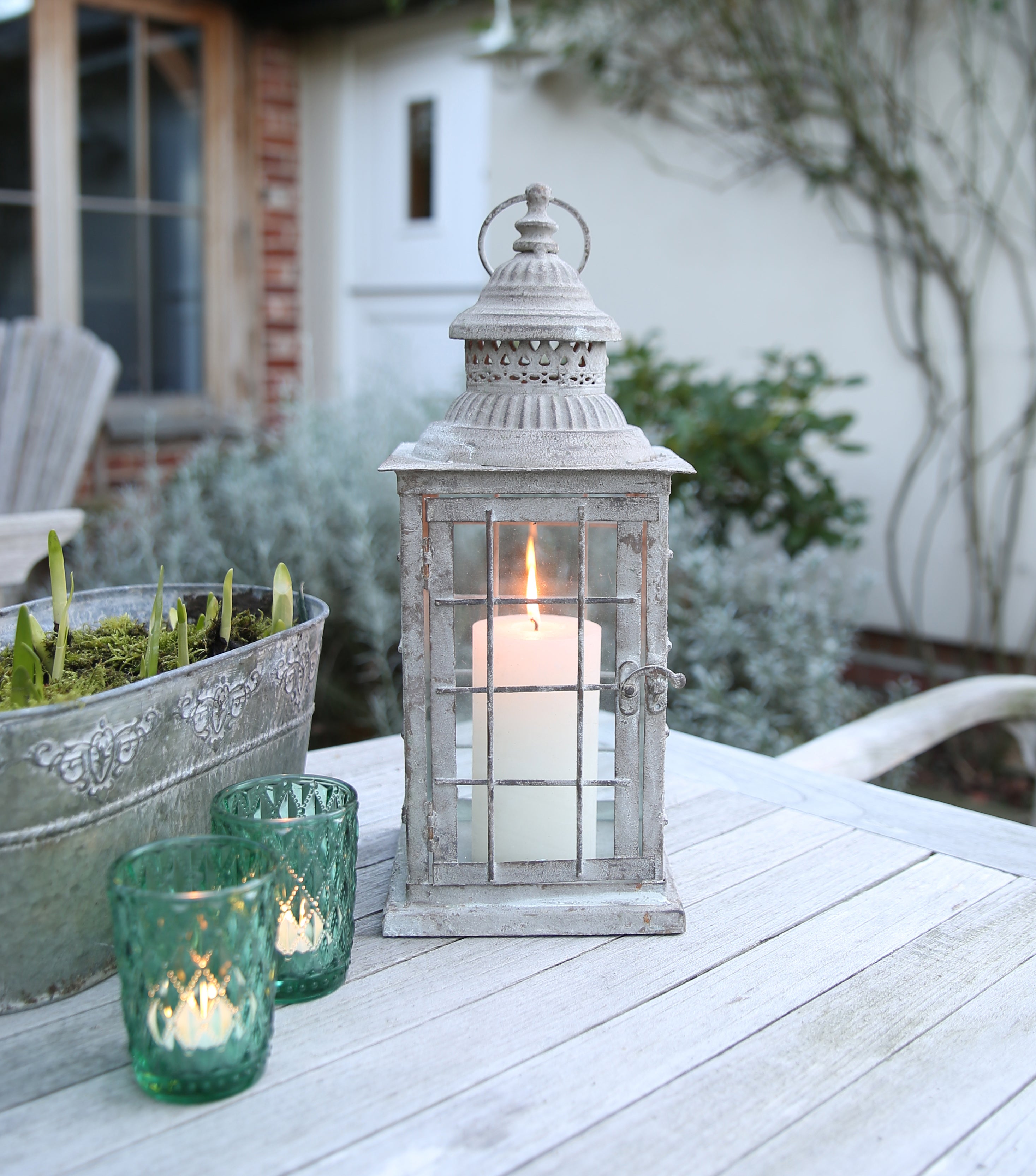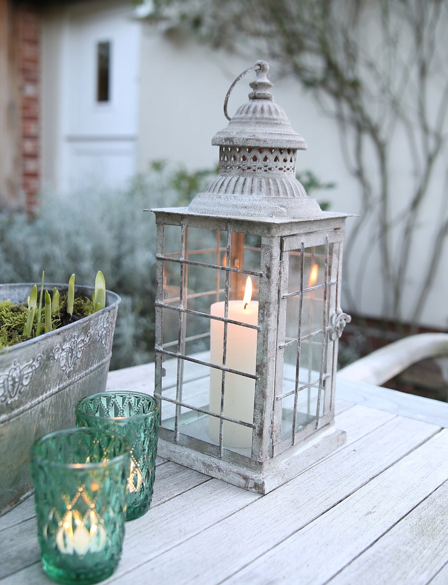 Lanterne in metallo in stile vintage adatte a tutte le stagioni. Ideali per la casa e il giardino. Create una piacevole luce serale con alcune di queste lanterne sparse in casa e in terrazza. Perfette per candele a colonna per un'illuminazione di lunga durata. Ogni lanterna ha una cornice in vetro incastonata in una struttura in metallo con foro superiore traforato e maniglia per il trasporto o l'appensione. La finitura in metallo anticato conferisce un delizioso tocco vintage. Vendute singolarmente.