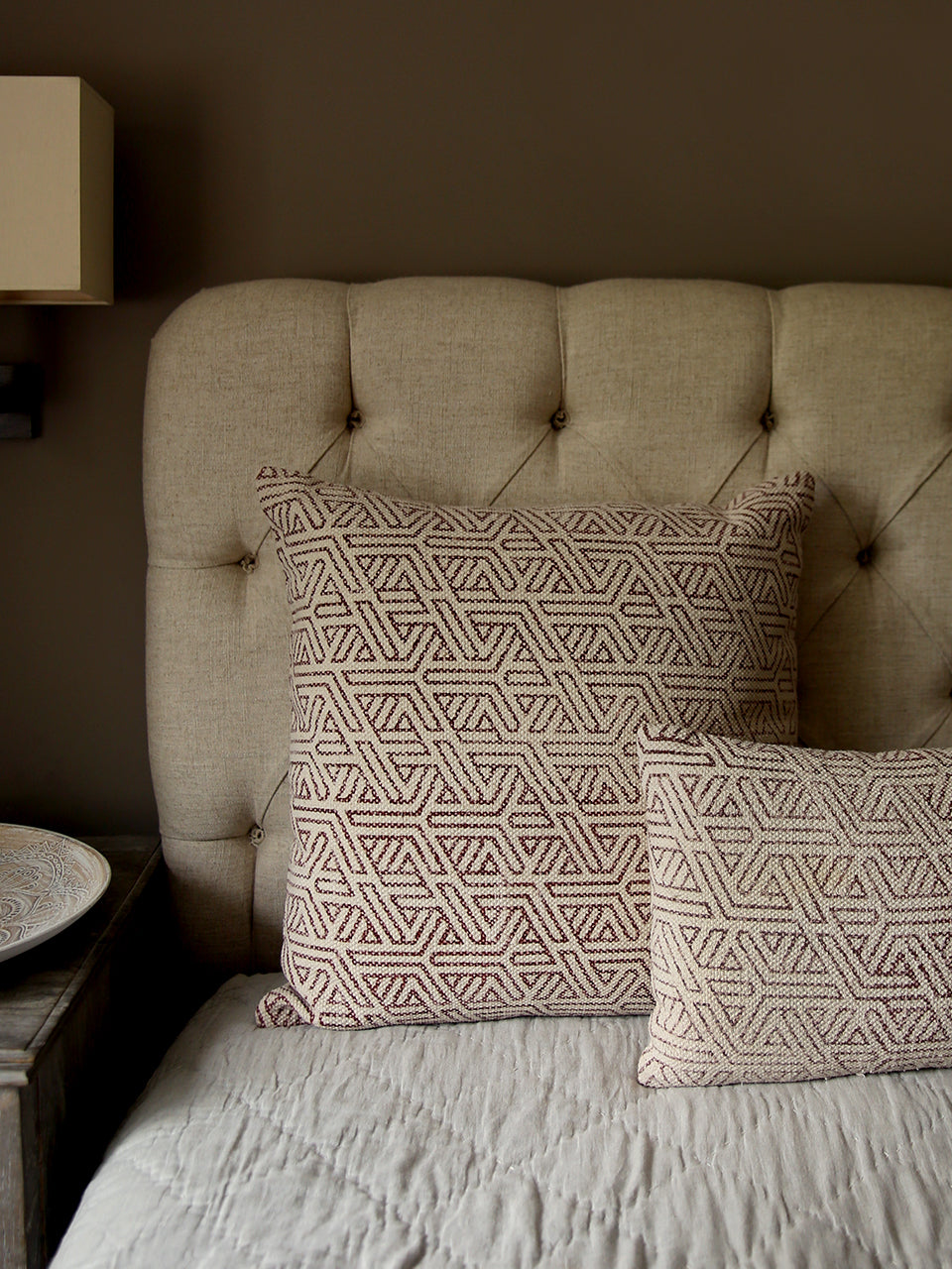 Un cuscino in cotone colorato meravigliosamente morbido con un caldo motivo color terracotta. La stampa a labirinto, delicatamente ripetuta, conferisce un aspetto sobrio, moderno e perfettamente rilassato. Completo di fodera per cuscino. La parte inferiore è in cotone bianco sporco. Disponibile in versione quadrata e rettangolare.