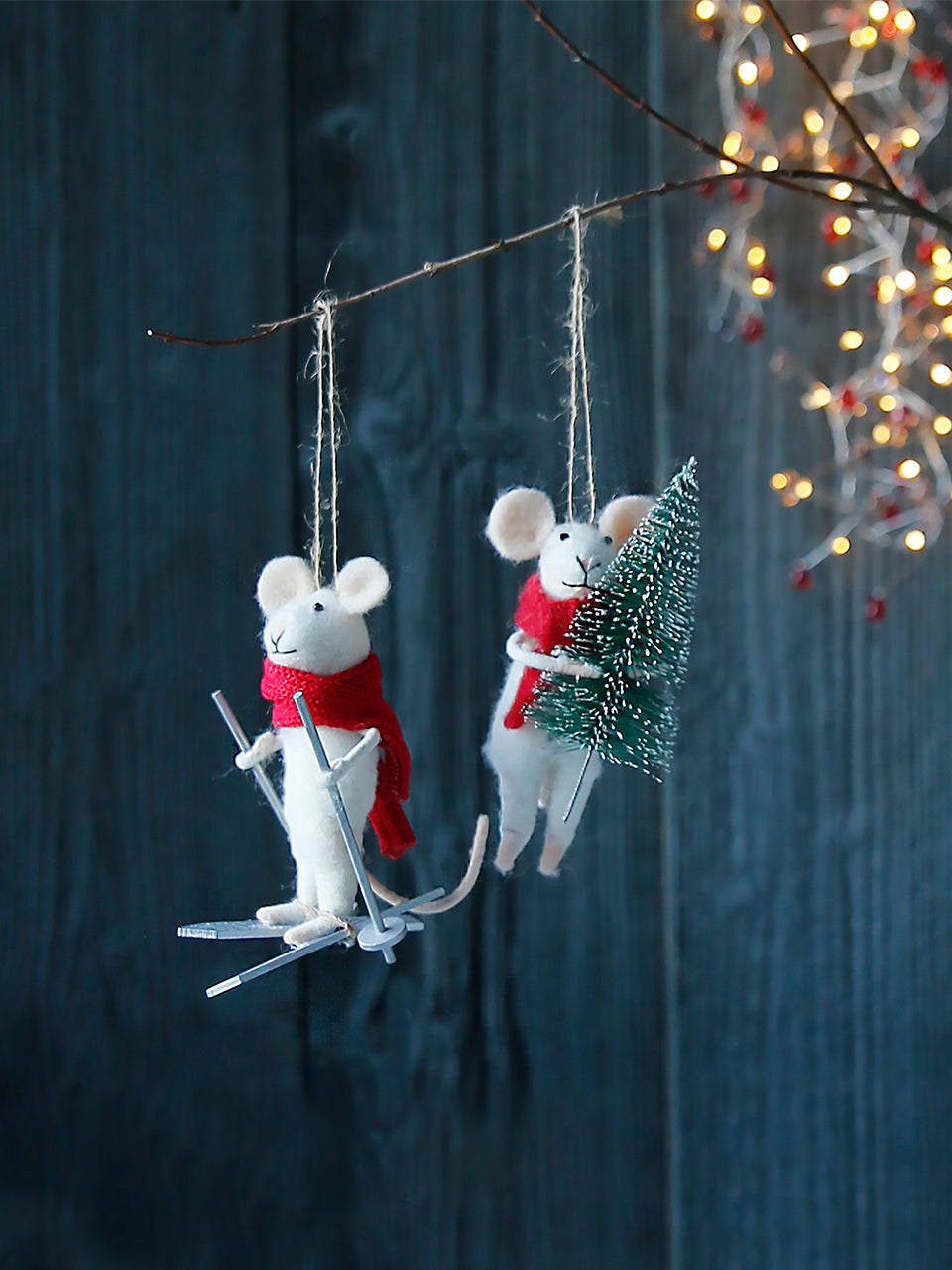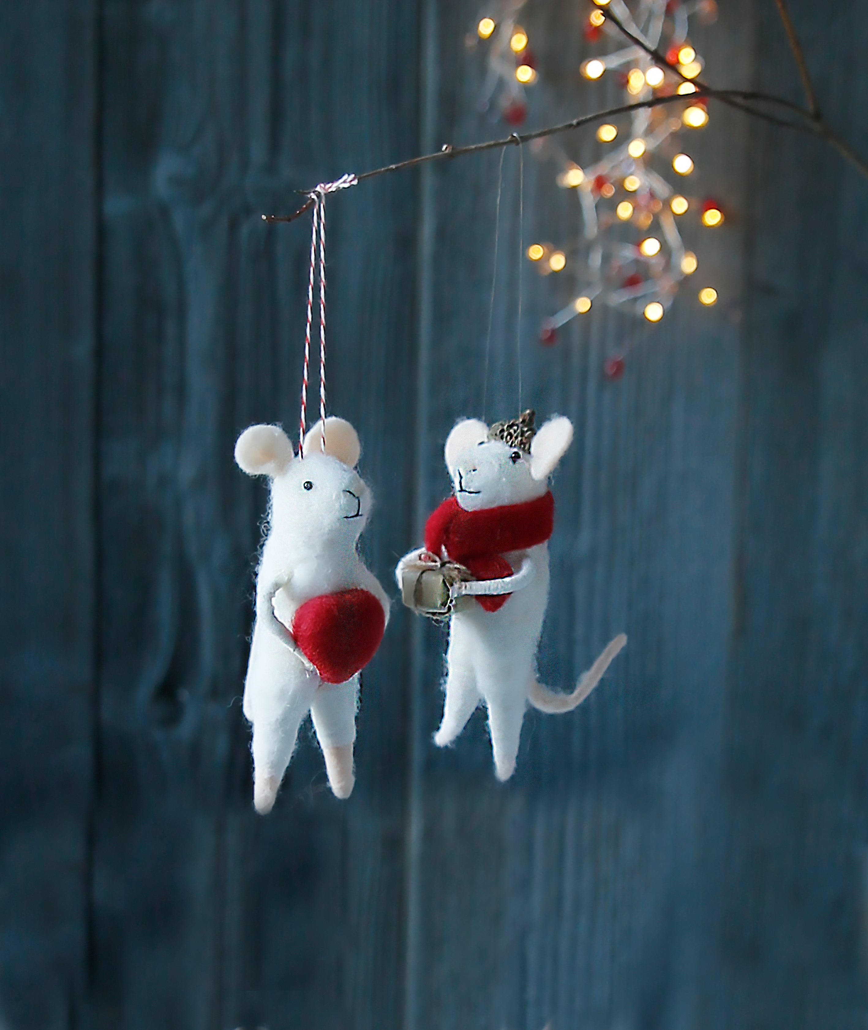Topi natalizi con vivaci dettagli rossi, avvolti in caldi abiti invernali, o che portano regali, un cuore o un albero d'argento. Pronti per essere esposti sull'albero di Natale e sicuramente apprezzati in ogni stagione festiva.