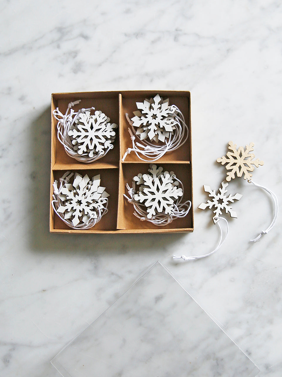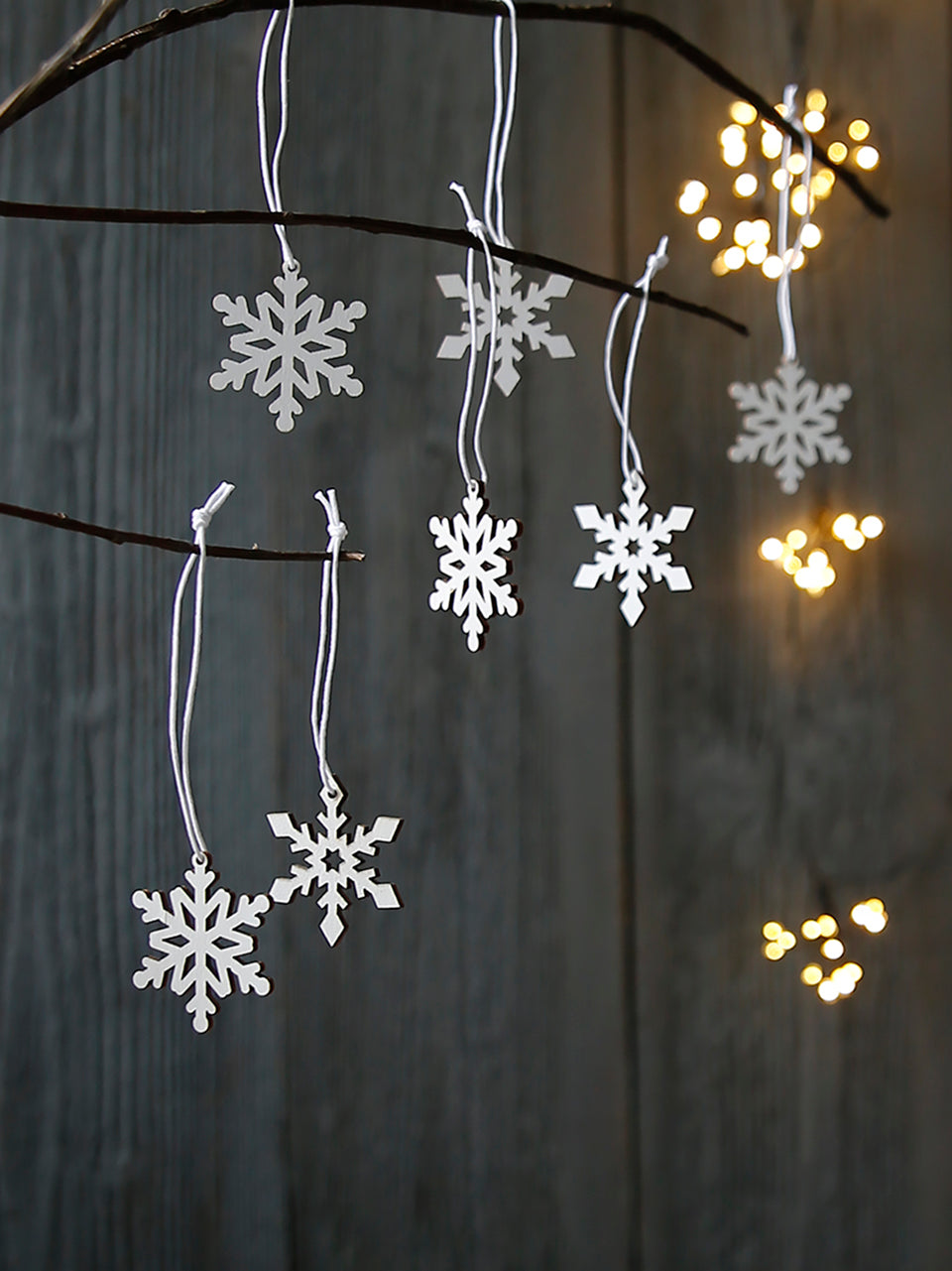 Set natalizio in legno con due decorazioni a forma di fiocco di neve. Il modo naturale per decorare l'albero di Natale o i tovaglioli degli ospiti e i regali. Ogni set include 24 decorazioni, 12 per ogni forma di fiocco di neve bianco con retro naturale.