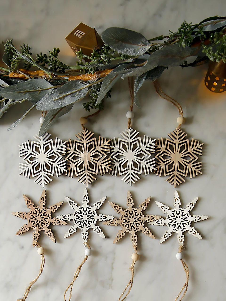 Ogni set include un totale di 8 fiocchi di neve in legno con due diversi design, realizzati in un mix di legno naturale e verniciato.